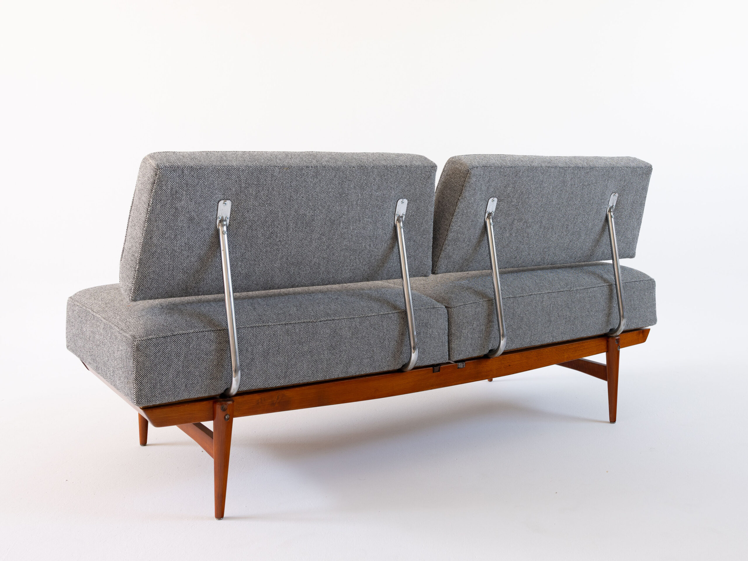 Ein Stück, das Geschichte erzählt, ohne nostalgisch zu wirken – klar in der Linie, ehrlich im Material. Die Konstruktion ist überraschend leicht und durchdacht. Mit wenigen Handgriffen – einfaches Drehen der Sitzflächen – wird aus dem Sofa eine Schlafgelegenheit.