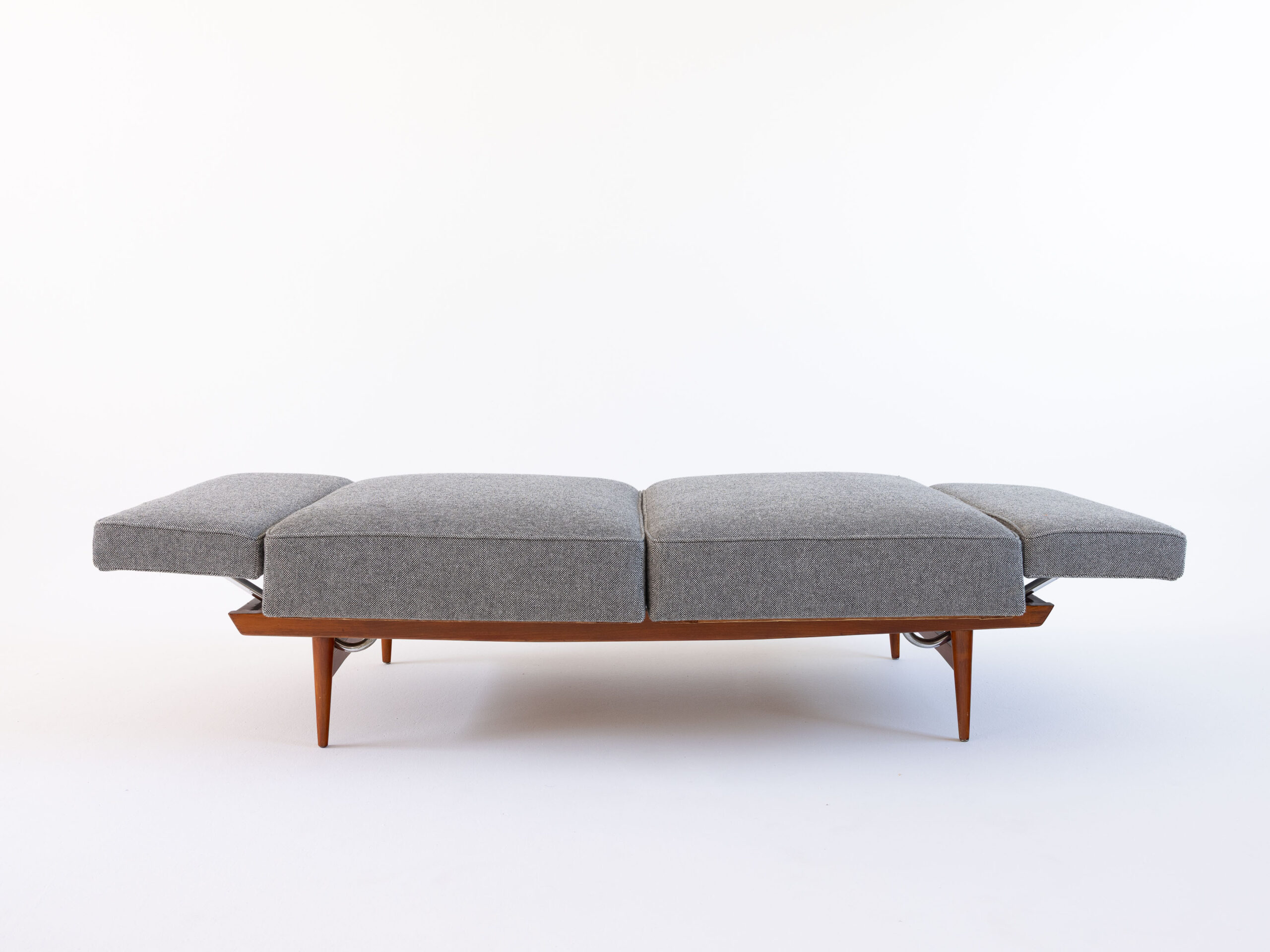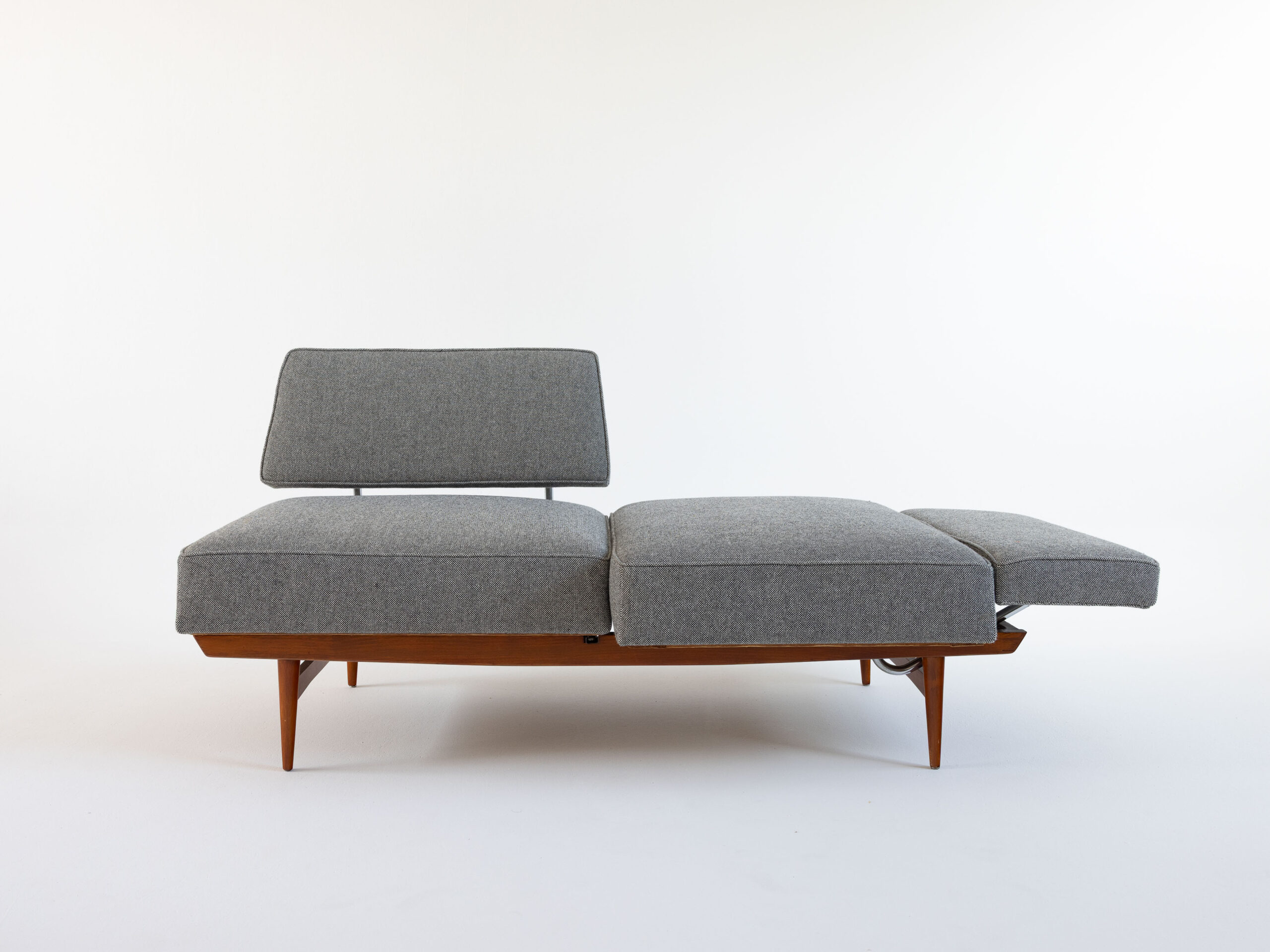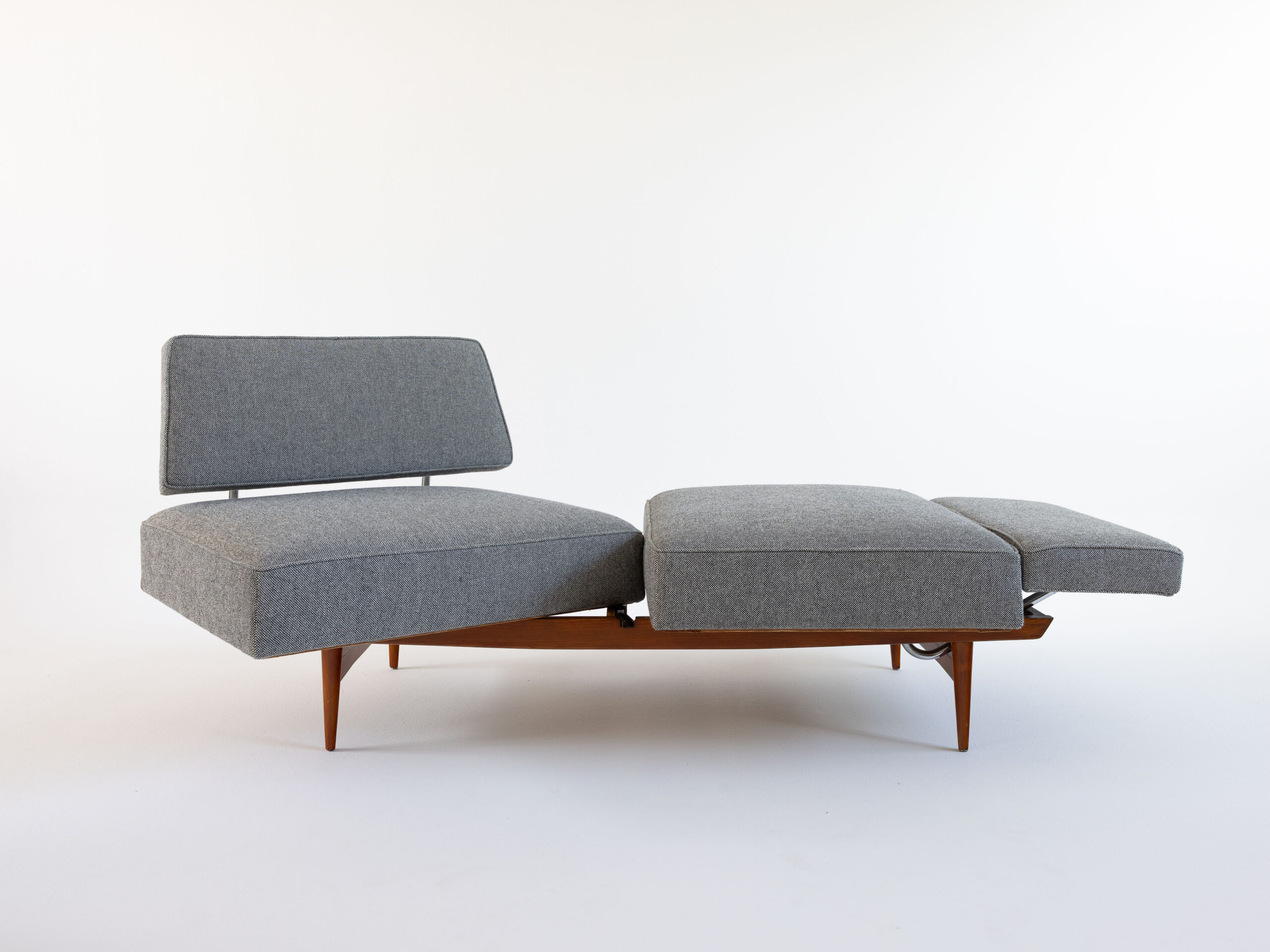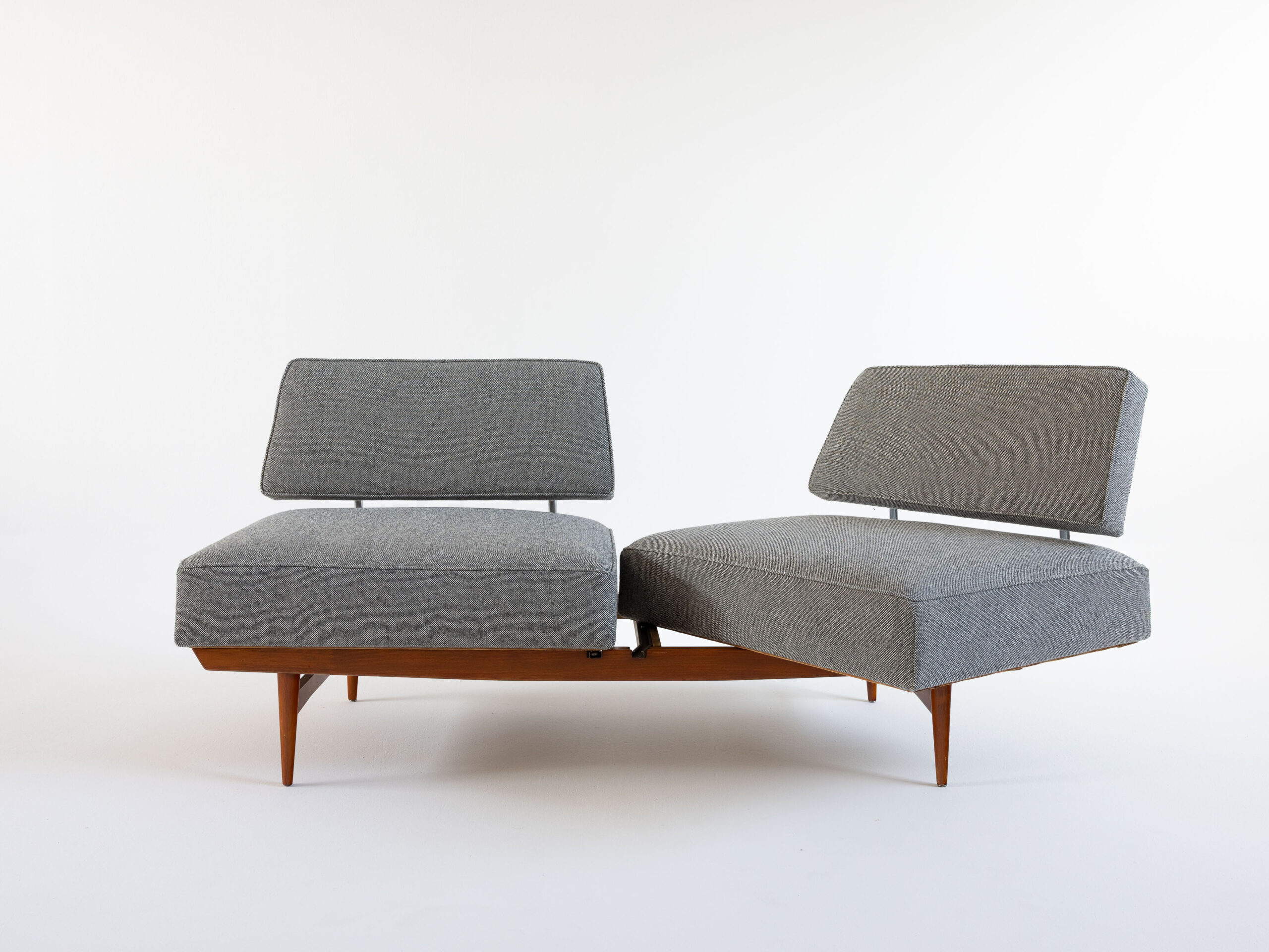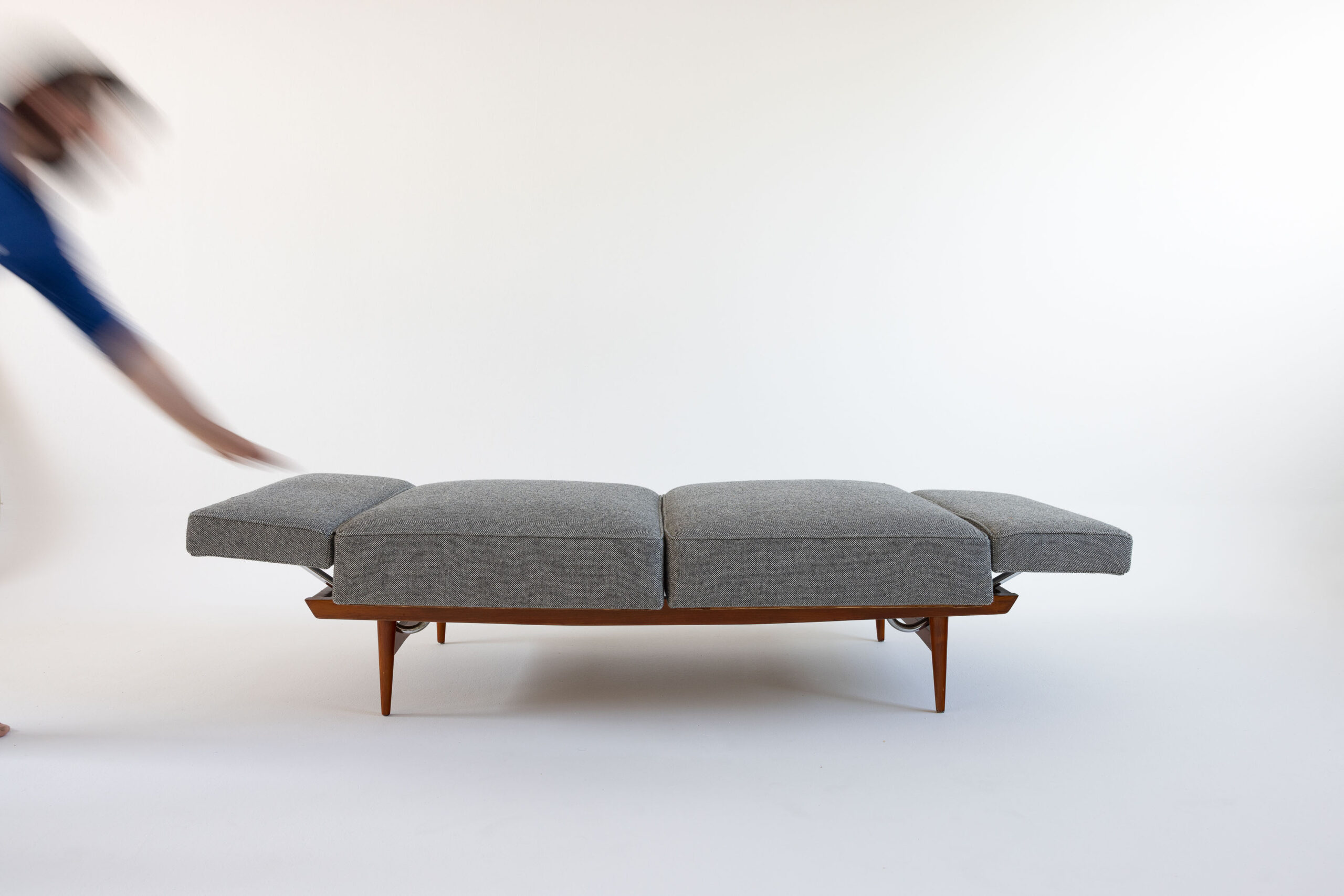 Ein Stück, das Geschichte erzählt, ohne nostalgisch zu wirken – klar in der Linie, ehrlich im Material. Die Konstruktion ist überraschend leicht und durchdacht. Mit wenigen Handgriffen – einfaches Drehen der Sitzflächen – wird aus dem Sofa eine Schlafgelegenheit.
