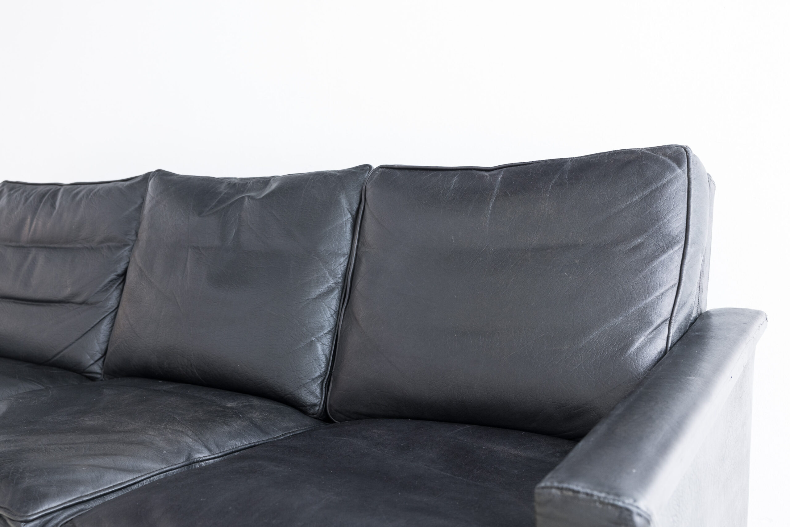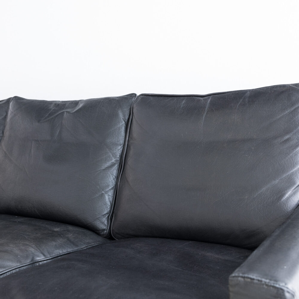 Die markante Sitzgruppe mit hochwertigem Lederbezug besteht aus einem Dreisitzer-Sofa und einem drehbaren Sessel. Die minimalistische Linienführung verleiht den Möbeln einen strengen Charakter. Sie wirken dank der Chromgestelle, der dynamisch geformten Armlehnen und der Narbung des Leders aber trotzdem wohnlich und bequem.
