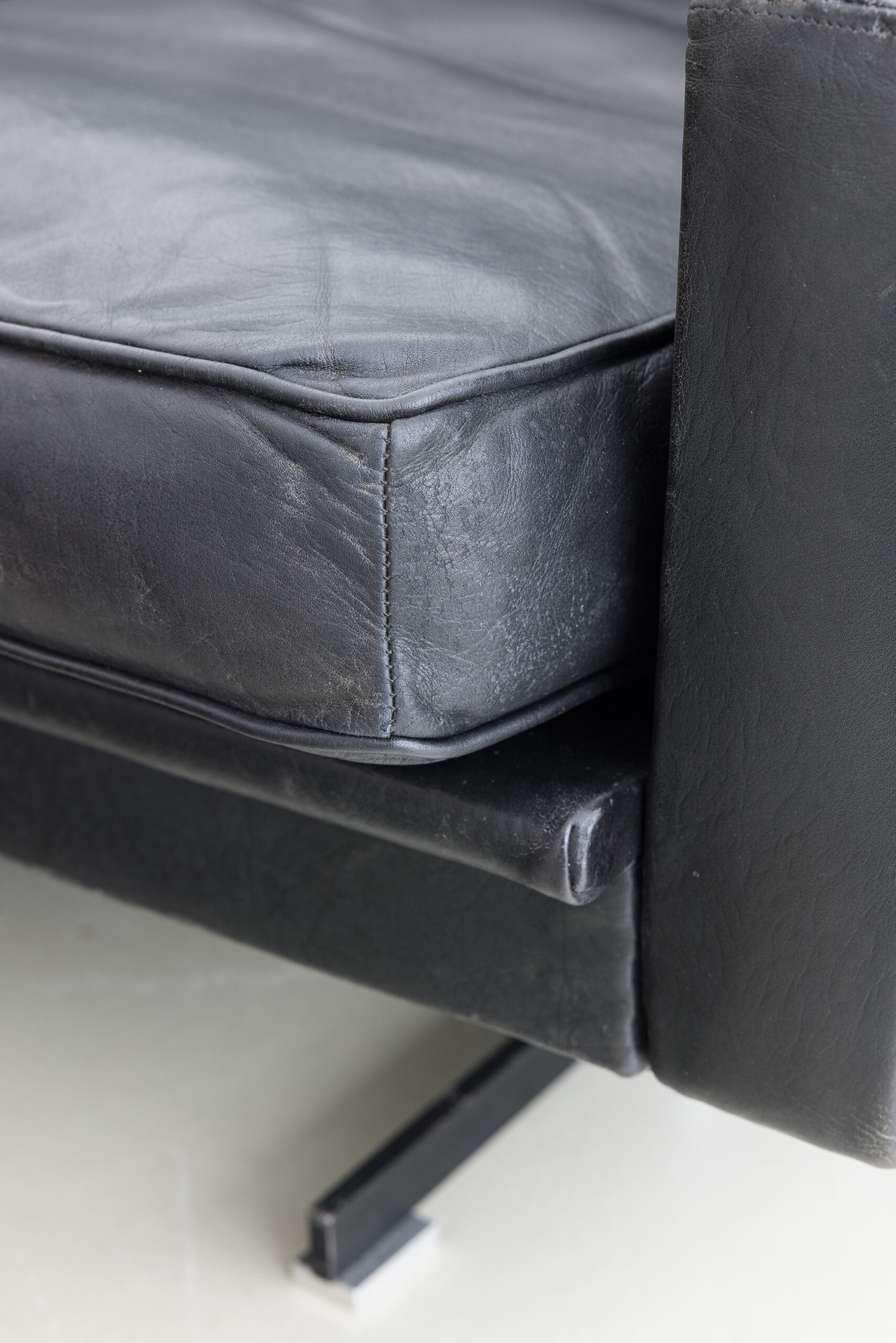 Die markante Sitzgruppe mit hochwertigem Lederbezug besteht aus einem Dreisitzer-Sofa und einem drehbaren Sessel. Die minimalistische Linienführung verleiht den Möbeln einen strengen Charakter. Sie wirken dank der Chromgestelle, der dynamisch geformten Armlehnen und der Narbung des Leders aber trotzdem wohnlich und bequem.