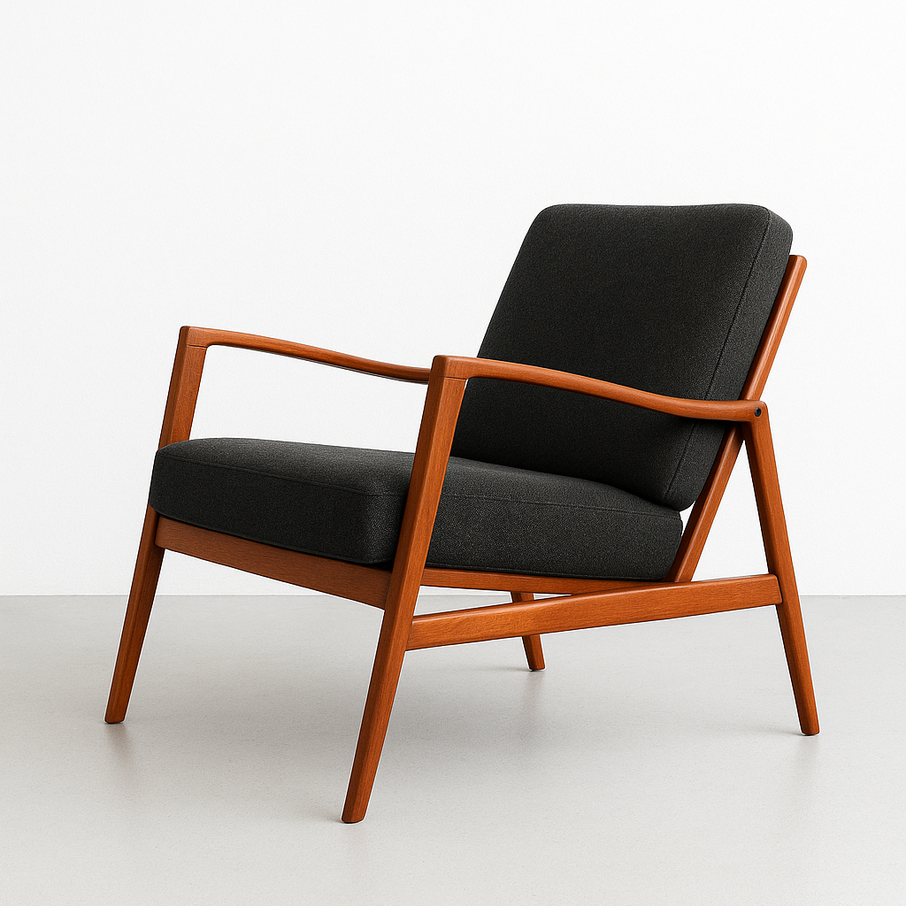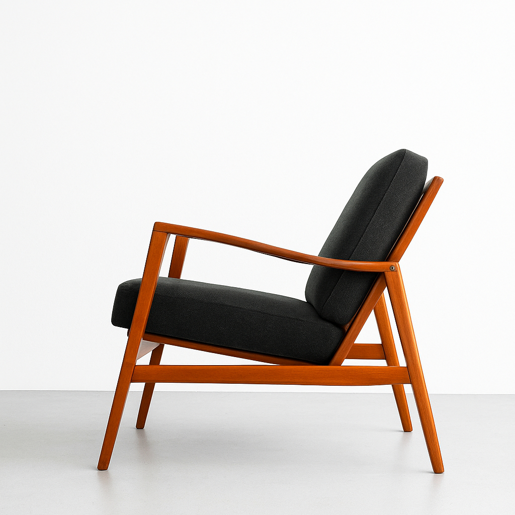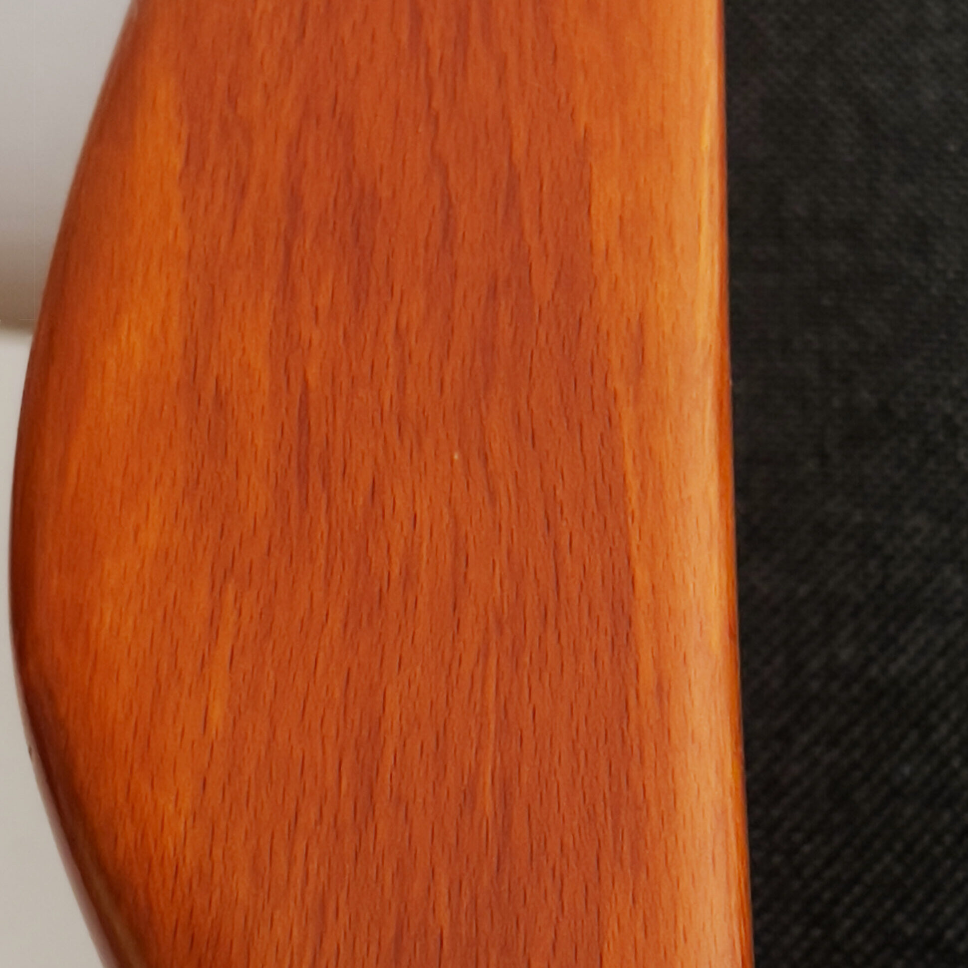 Dieser Sessel wurde komplett überarbeitet. Der Lack des Nußbaum/Bucheholzgestells wurde abgezogen, wie damals üblich, teakfarben gebeizt. Die Oberfläche ist mit Hartöl neu versiegelt. Das Holz ist jetzt matt glänzend und die Maserung wieder lebendig. Die Gestelle sind neu verleimt, Polsterung und Bezug wurden erneuert. Der Bezug ist ein grau melierter Möbelstoff, in Leinenbindung.