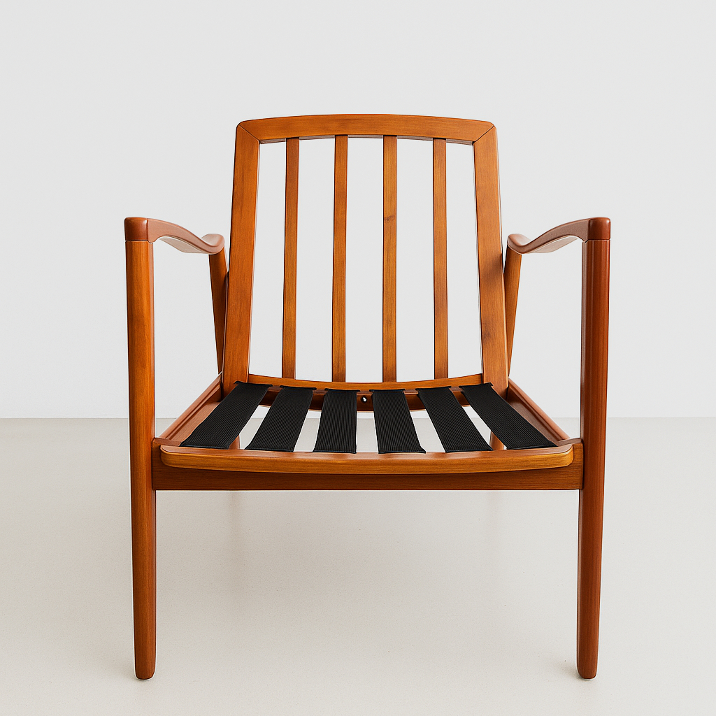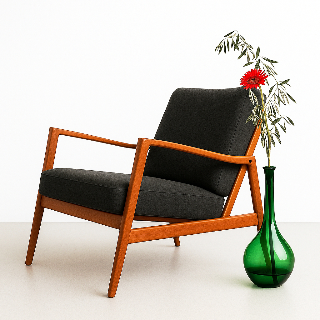 Dieser Sessel wurde von Hartmut Lohmeyer gestaltet und später vom Werk überarbeitet. Er gehört heute zu den beliebtesten Entwürfen der 50er Jahre. Die Sitzschale scheint auf dem filigranen Holzgestell zu schweben. Die organisch geformten Armlehnen schmeicheln der Hand.